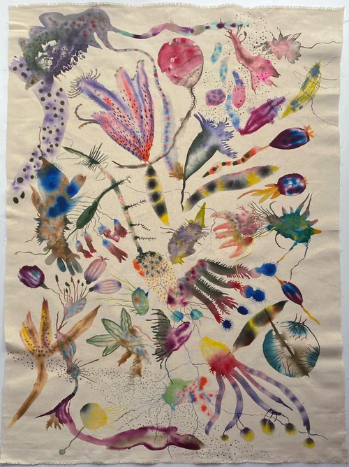 In this exhibition, I invite you into my experimental process, blending fabric and drawing to uncover a dreamlike yet organic world. My pieces transport us to silent, intricate spaces filled with forms that feel alive—plants, lichens, algae, and microscopic life.